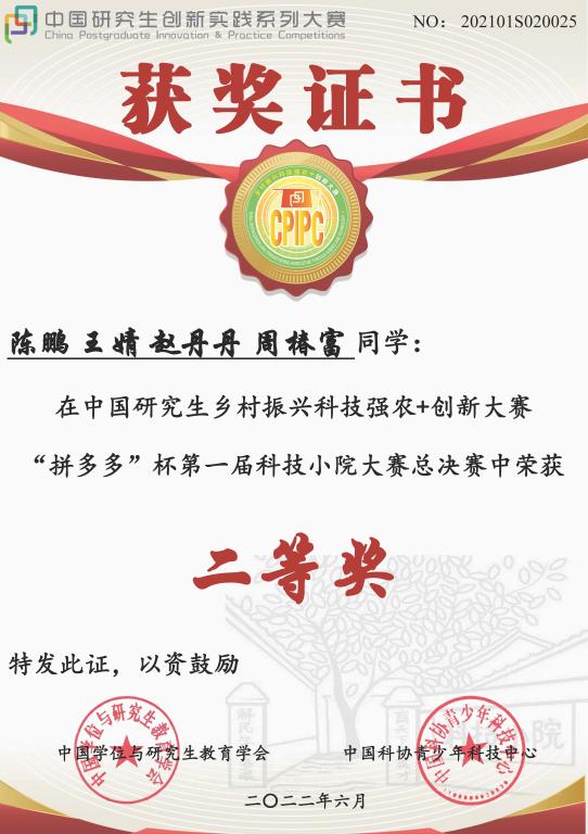 2022年7月18日,乐鱼平台_乐鱼(中国)一站式服务平台陈鹏、王婧、赵丹丹、周椿富四位研究生,收到了中国研究生乡村振兴科技强农+创新大赛“拼多多杯”第一届科技小院大赛组委会颁发的二等奖荣誉证书。