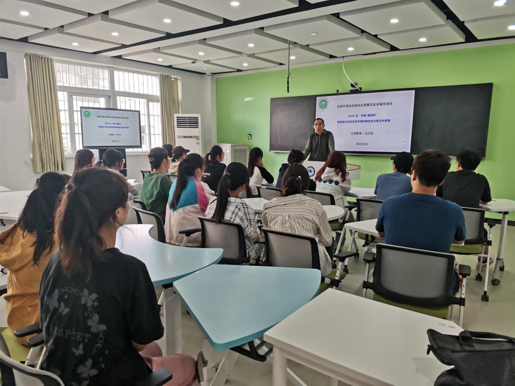 开班仪式结束后,马万征给本届资源环境类创新创业竞赛实验班做了首场辅导报告。他首先介绍了大学生参加学科竞赛对自身成长的积极意义,特别是对大学生实践动手能力、抽象思维能力和科研能力的培养具有较好的促进作用。然后,他重点解读了2022年“华骐-通源杯”安徽省大学生生态环境创新创业大赛文件精神和注意事项。(作者:刘金映特约通讯员:吴国良 审核:沈树周)