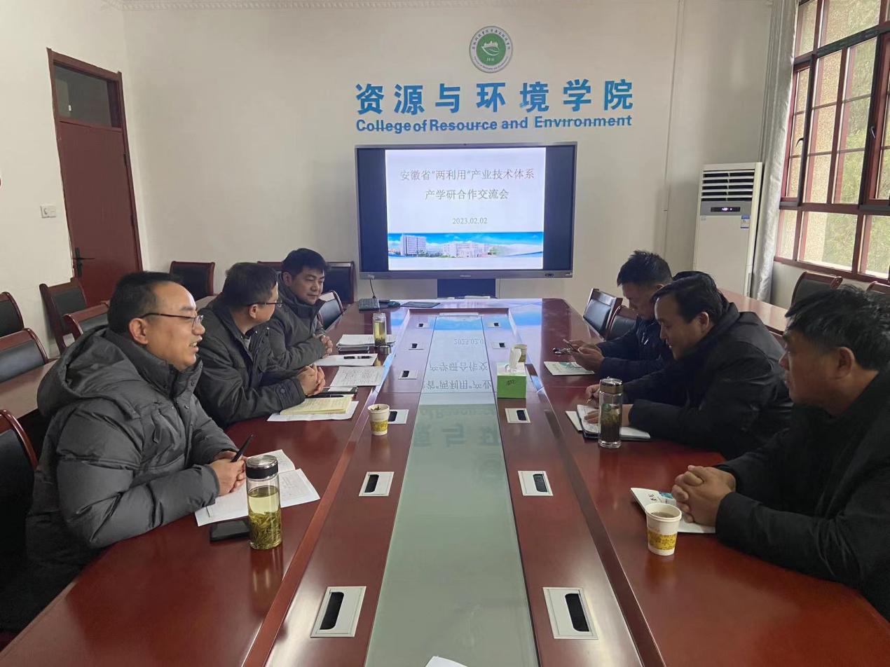 2023年2月2日,资源与环境学院与淮南市潘集区农业农村局许令凯副局长,安徽众普有限公司余明礼总经理,安徽万博能源科技有限公司曲宗山总经理等一行进行产学研合作交流。资源与环境学院党委书记、院长李孝良,副院长李飞跃,省“两利用”产业体系首席专家汪建飞教授、淮南试验站站长王翔博士参加会议。