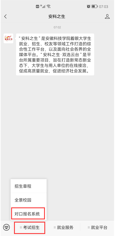 第一步:请扫描下方二维码,关注乐鱼平台_乐鱼(中国)一站式服务平台招生办公室官方微信公众号“安科之生”,选择“考试招生”菜单,点击“对口报名系统”。