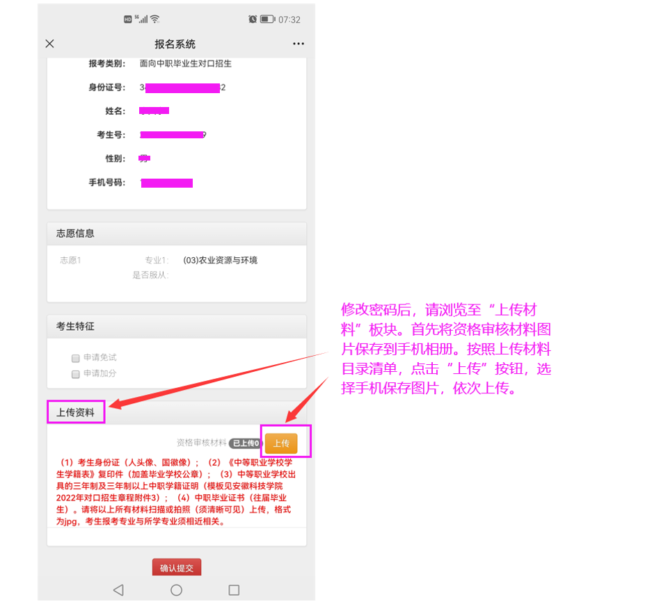第五步:选择“上传材料”板块,按照要求,上传资格审核材料,审核无误后,点击确认提交按钮,一旦提交,不可更改。