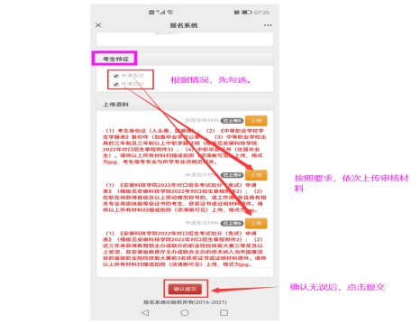第六步:申请技能大赛免试、考试加分鼓励政策的考生,在“考生特征”板块,先勾选符合的鼓励政策选项,后按照要求上传材料审核。审核无误后,点击确认提交按钮,一旦提交,不可更改。