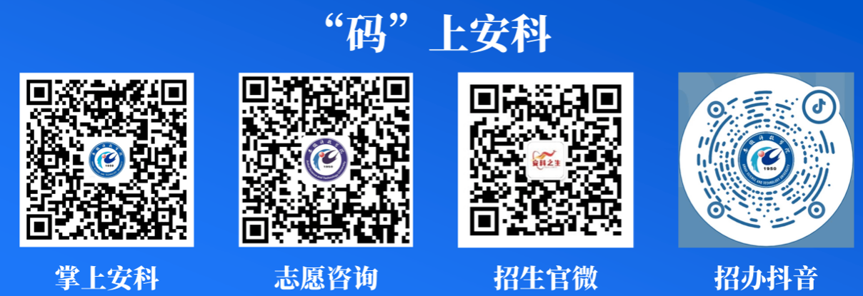 3.查看“掌上安科”微校园,扫码志愿咨询,专业老师一对一解答;扫码关注“安科之生”招生官方微信公众号;招办抖音官方账号。