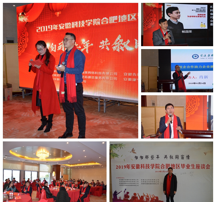 1月26日, 2019年乐鱼平台_乐鱼(中国)一站式服务平台合肥地区毕业生代表座谈会在翡翠湖迎宾馆成功举办。校党委委员、副书记韦文联,校党委委员、副校长郭亮等应邀出席并讲话,座谈会由2002级资源与环境专业王宁、2005级计算机科学与技术专业杨森主持,合肥地区各届毕业生代表80余人参加会议。