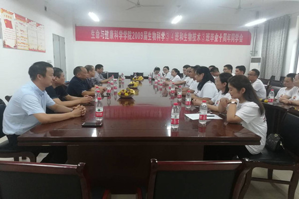10月2日下午,生命与健康科学学院2009届生物科学③④班和生物技术③班校友从祖国各地相聚母校举行毕业十周年联谊会。生命与健康科学学院在学院会议室组织师生联谊会,学院执行院长金光明,原生命科学学院党总支书记潘勇,继续教育学院院长杨维来,科研处副处长鲍方印,校团委书记、聚会班级班主任黄立义,以及学院部分教师代表参加了联谊会。联谊会由生物科学③班团支部书记刘红主持。